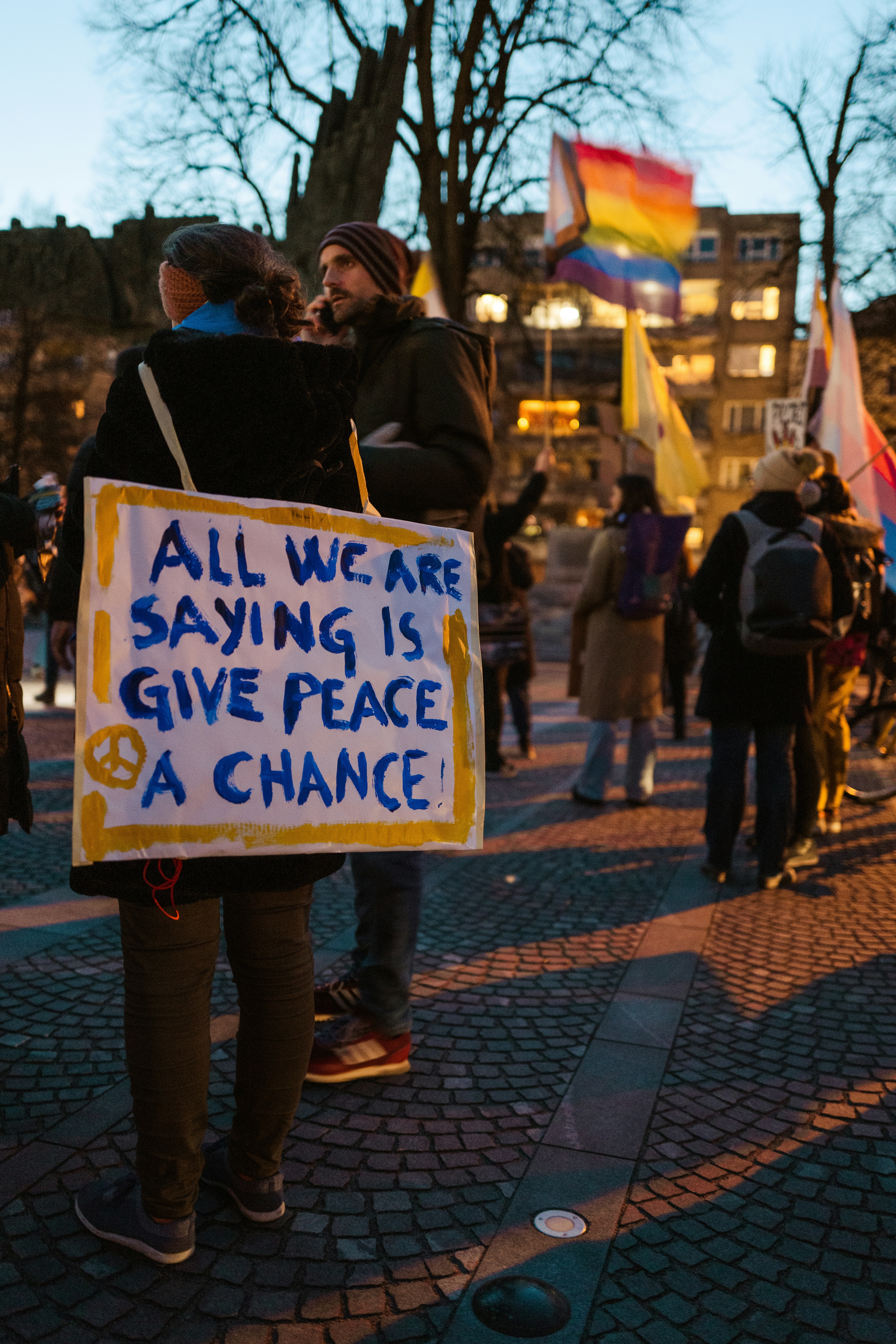 a group of people holding a sign that says all we are saying is give peace